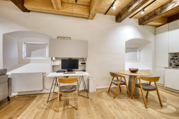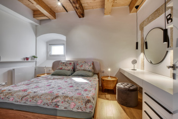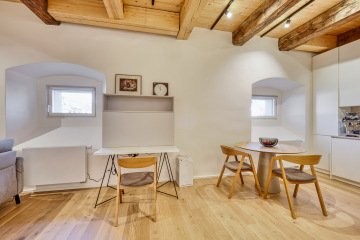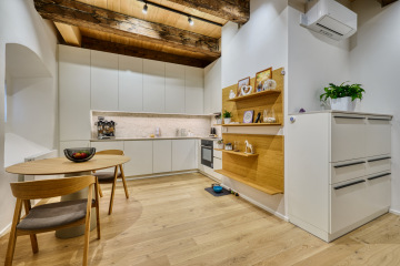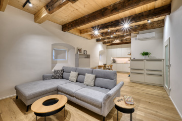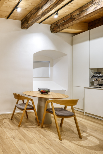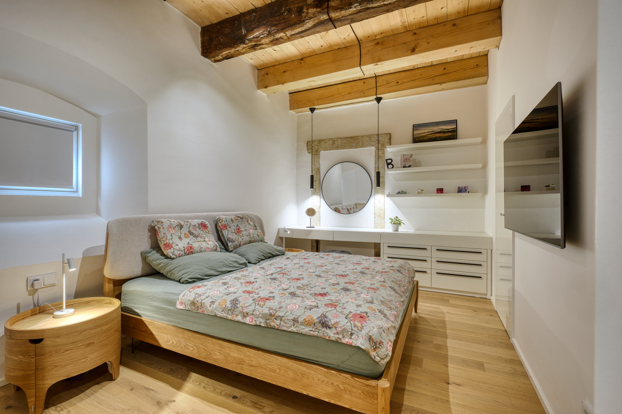 Tato realizace patří právě k nim. Citlivě propojuje současný design s charakterem původní architektury a dává vyniknout autentickým prvkům, které prostoru propůjčují jedinečný výraz. Přiznané trámy, kamenné detaily a menší okenní otvory se zde staly přirozenou součástí kompozice, se kterou moderní interiér pracuje s respektem a lehkostí.